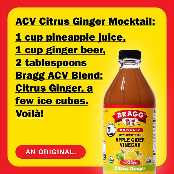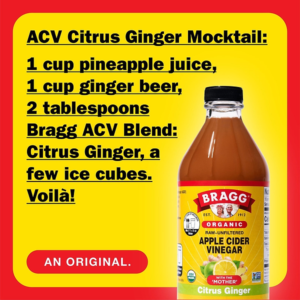 Get your daily dose of wellness with the zesty mix of organic Bragg® Apple Cider Vinegar, citrus, and ginger. Crafted with real, flavorful ingredients, Citrus Ginger Apple Cider Vinegar Blend offers a range of benefits, including 750 mg of acetic acid per serving.