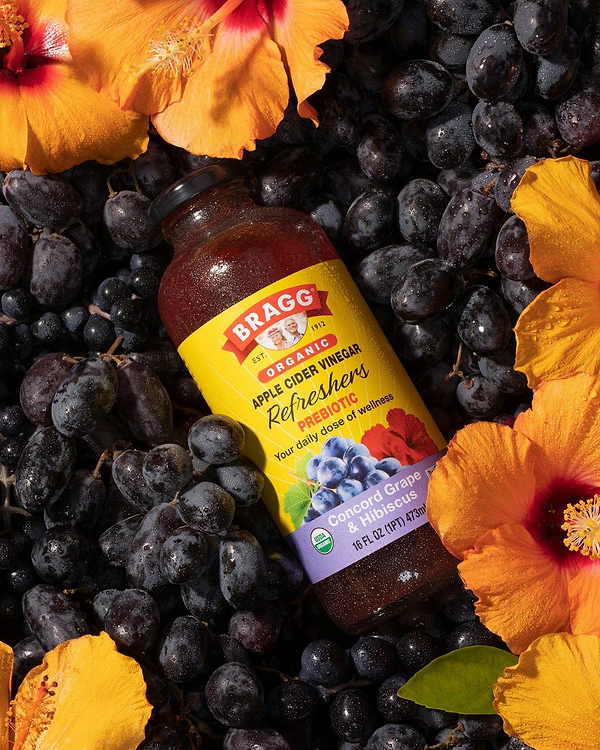 Enjoy the wellness of Bragg® Organic Apple Cider Vinegar in a ready-to-drink, delicious beverage. Our Concord Grape & Hibiscus ACV Refreshers offer fruity and floral flavors with 750 mg of acetic acid per serving. Each Concord Grape & Hibiscus ACV Refresher is crafted with organic ingredients, no artificial coloring or preservatives, and just 15 calories per serving.
