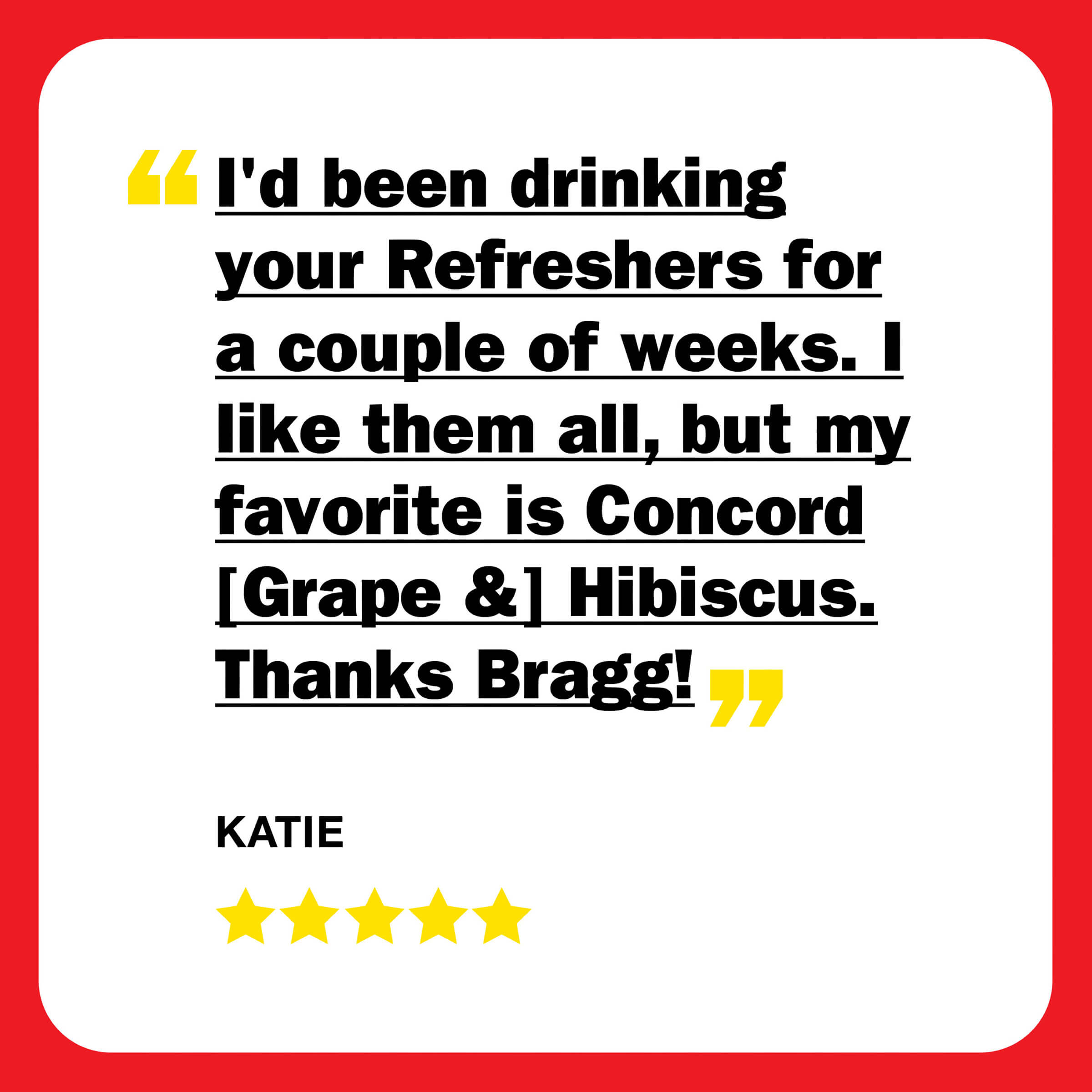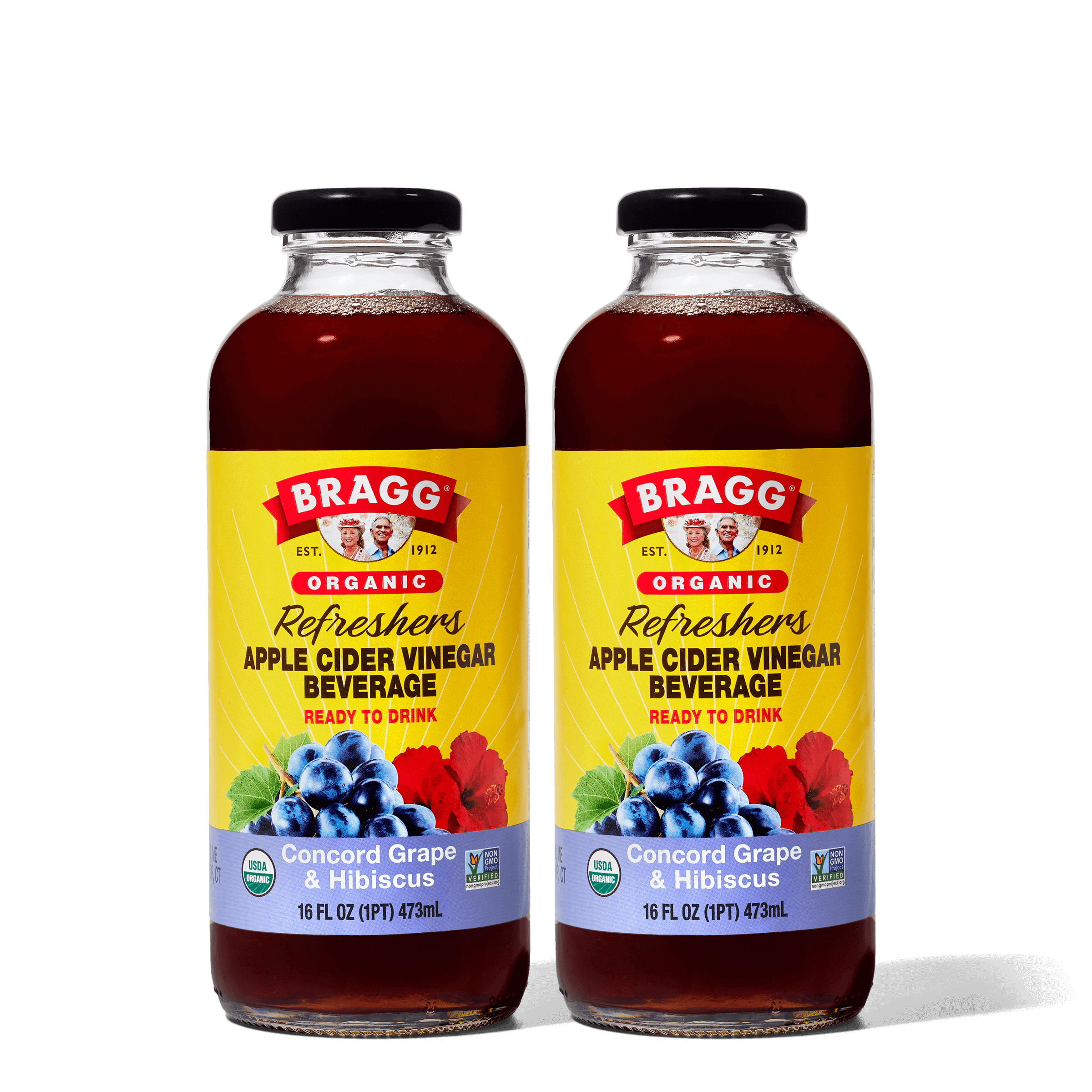 Enjoy the wellness of Bragg® Organic Apple Cider Vinegar in a ready-to-drink, delicious beverage. Our Concord Grape & Hibiscus ACV Refreshers offer fruity and floral flavors with 750 mg of acetic acid per serving. Each Concord Grape & Hibiscus ACV Refresher is crafted with organic ingredients, no artificial coloring or preservatives, and just 15 calories per serving.