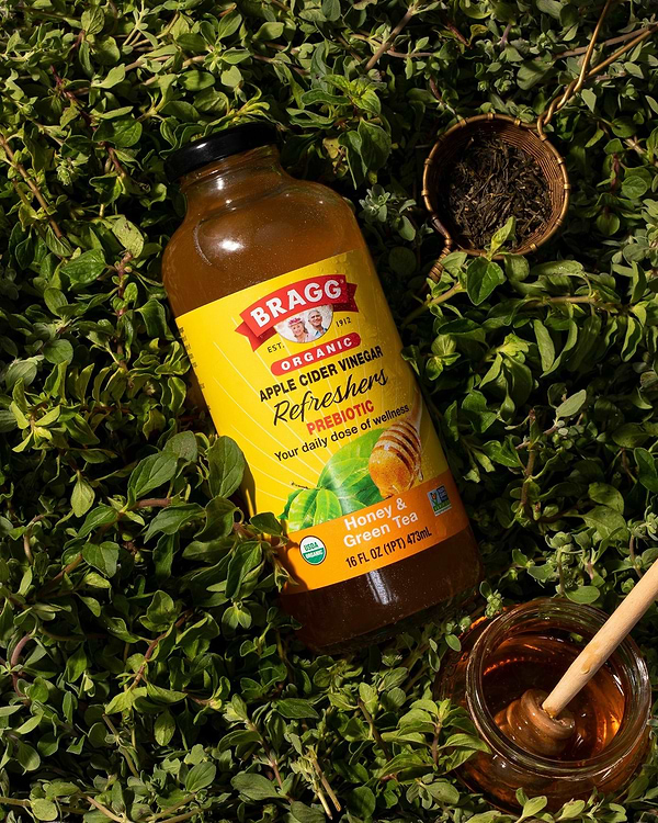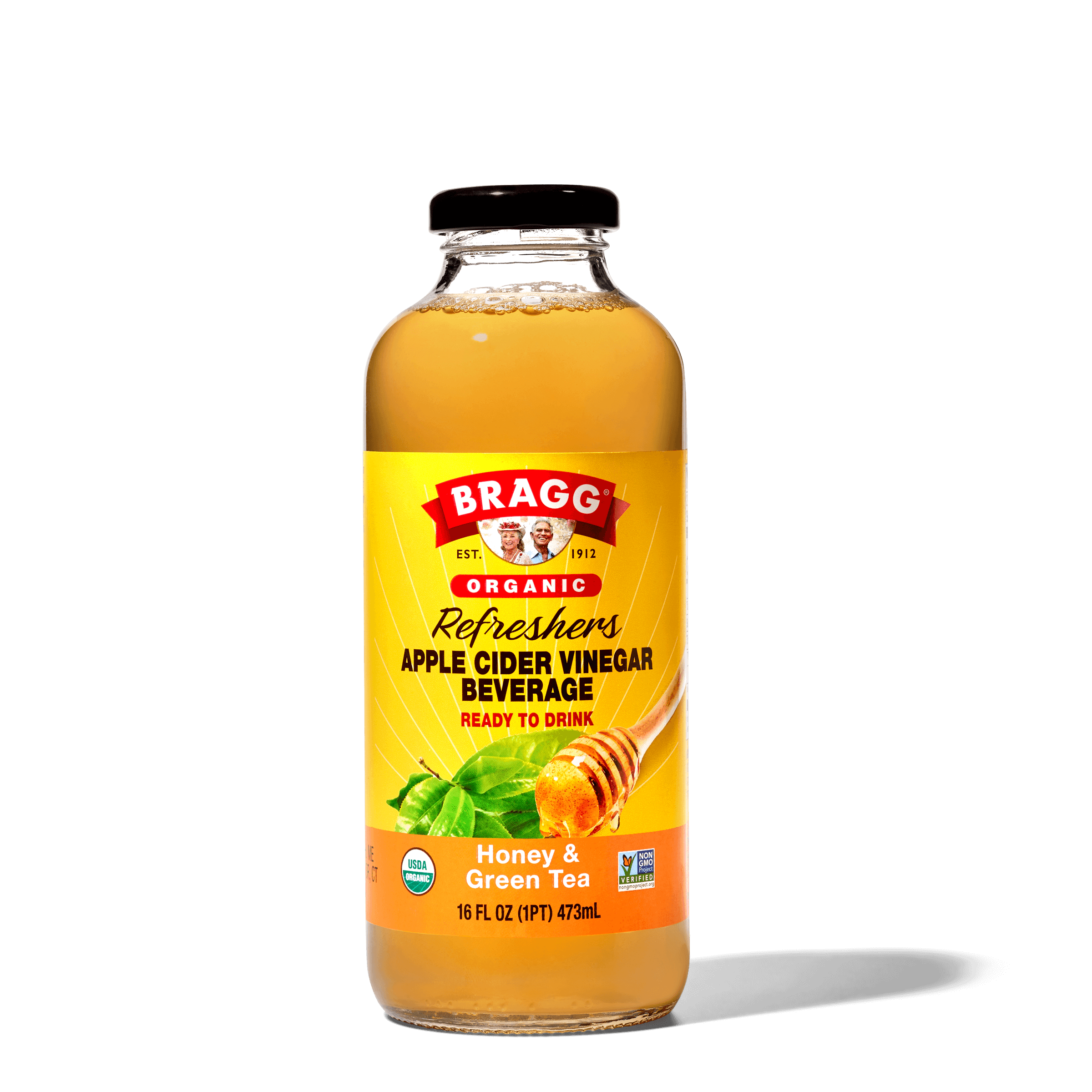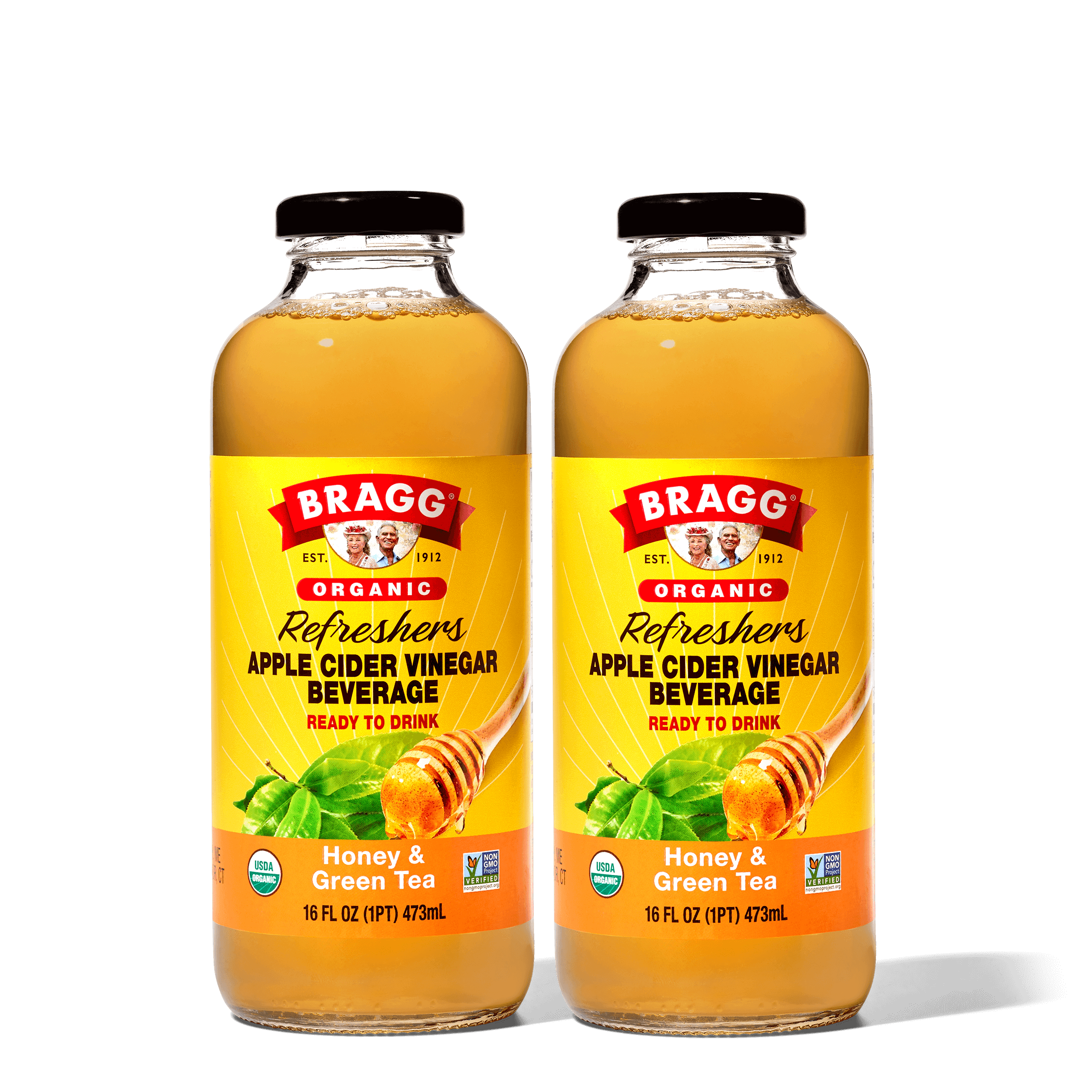 Enjoy the wellness of Bragg® Organic Apple Cider Vinegar in a ready-to-drink, delicious beverage. Our Honey & Green Tea ACV Refreshers offer a smooth, complex flavor profile with a hint of vanilla and 750 mg of acetic acid per serving. Each Honey & Green Tea ACV Refresher is crafted with organic ingredients, no artificial coloring or preservatives, and just 35 calories per serving.
