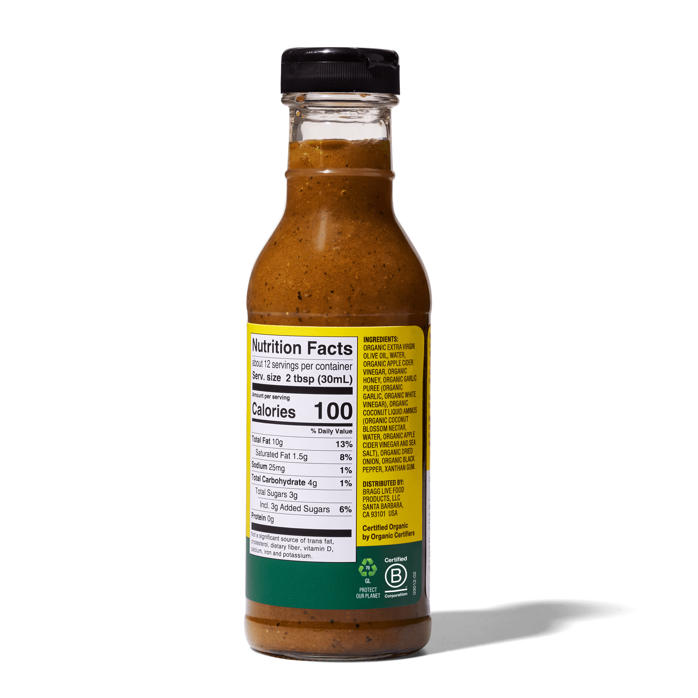 Organic Extra Virgin Olive Oil, Water, Organic Apple Cider Vinegar, Organic Honey, Organic Garlic Puree (Organic Garlic, Organic White Vinegar), Organic Coconut Liquid Aminos (Organic Coconut Blossom Nectar, Water, Organic Apple Cider Vinegar and Sea Salt), Organic Dried Onion, Organic Black Pepper, Xanthan Gum.