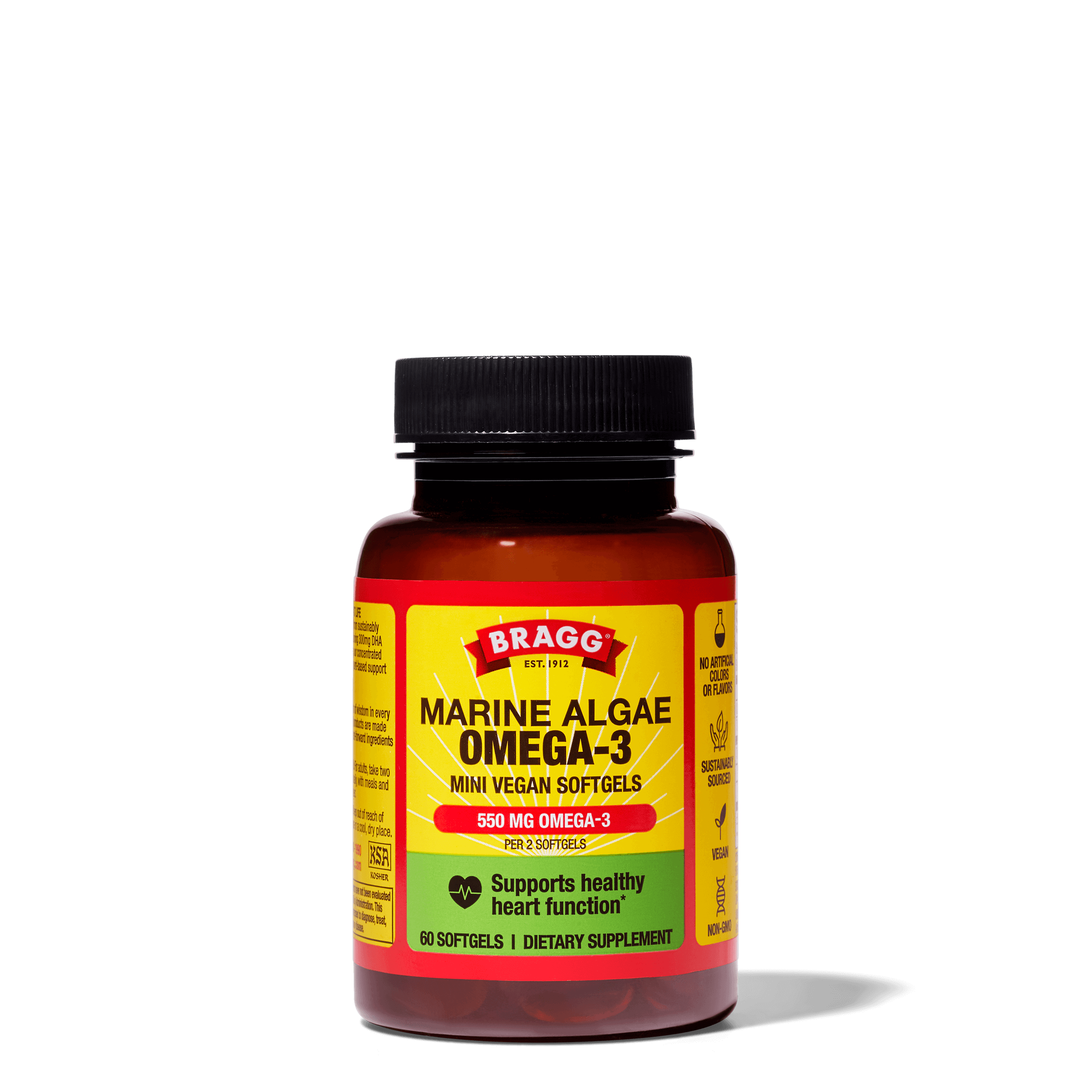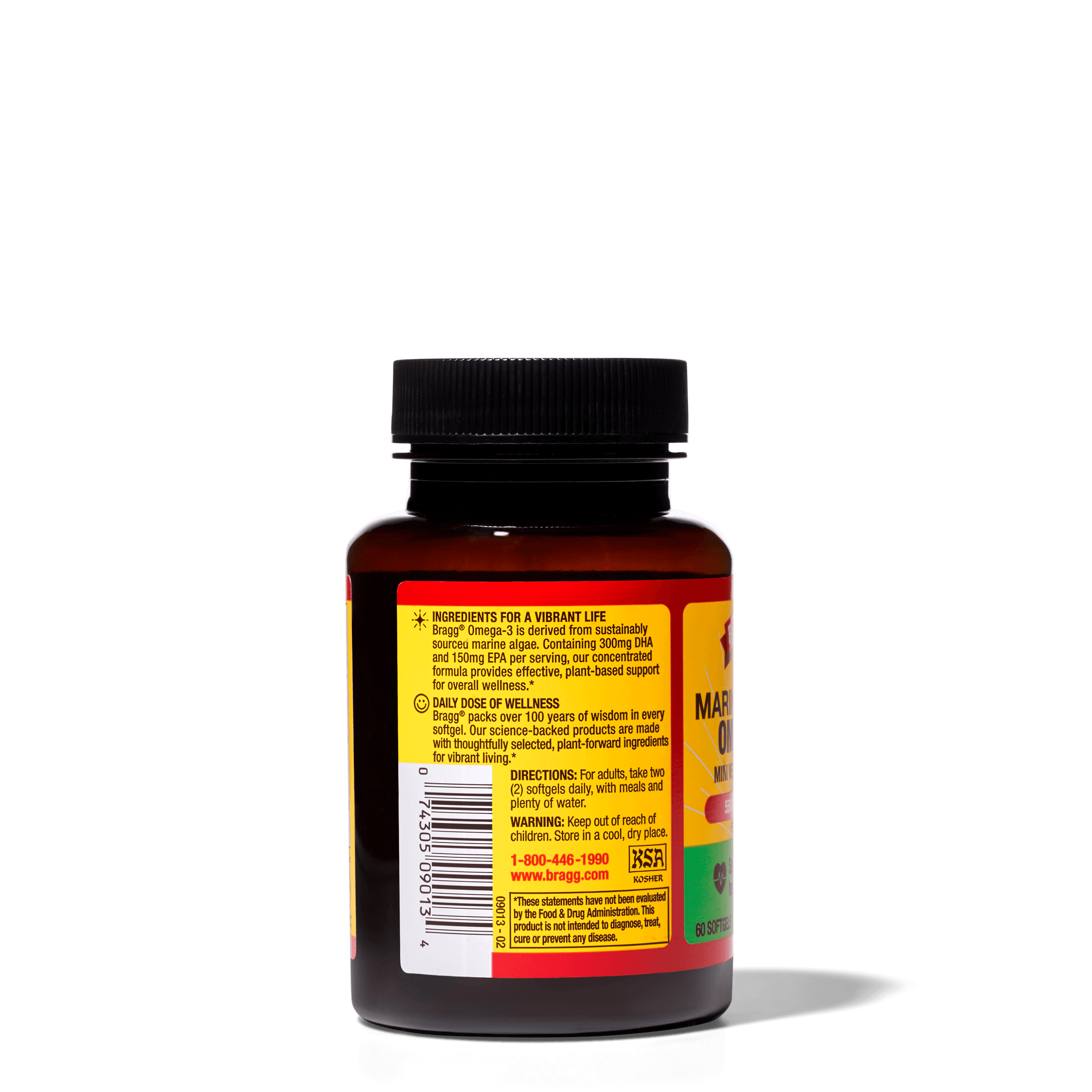 Bragg® Omega-3 is derived from sustainably-sourced marine algae. Containing 300mg DHA and 150mg EPA per serving, our concentrated formula provides effective, plant-based support for overall wellness.